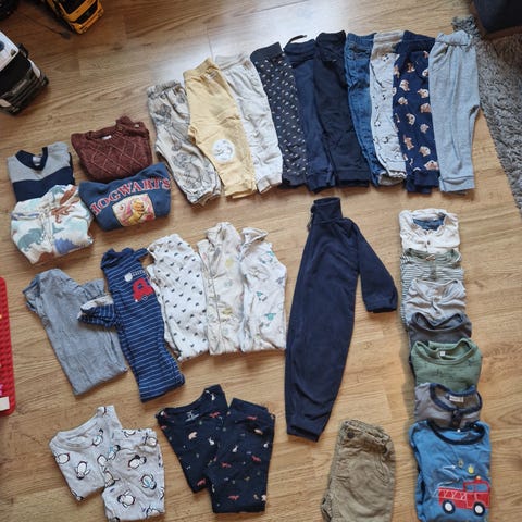 Inneholder 2 shorts, t- skjorte, flere bukser, ei ullbukse, 3 jakker, to hals (en i merinoull), 2 vester til finbruk