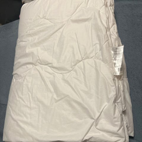 Jysk Dream Zone quiltet dyne tjuk 1 cm i hvit farge. Dynen har en quiltet overflate og er utstyrt med stropper for enkel festing til sengetøy. Materialet er lett og fint og størrelsen er 190x140cm,lite brukt.