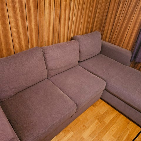 Godt brukt brun treseter med sjeselong. Har uttrekkskuff slik at den kan bli sovesofa. Høyre armlene er pr nå demontert for å få plass, kan skrus på igjen.