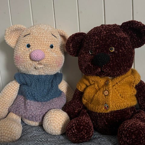 Myk kosebamse med 7 håndlagde klesplagg. Alt nytt. Selges samlet.