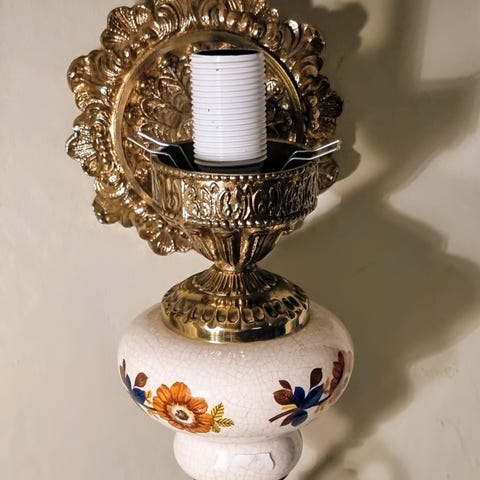 Gammelt messing-oppheng med ring til strekk-forsterkning. Led pære, E27.