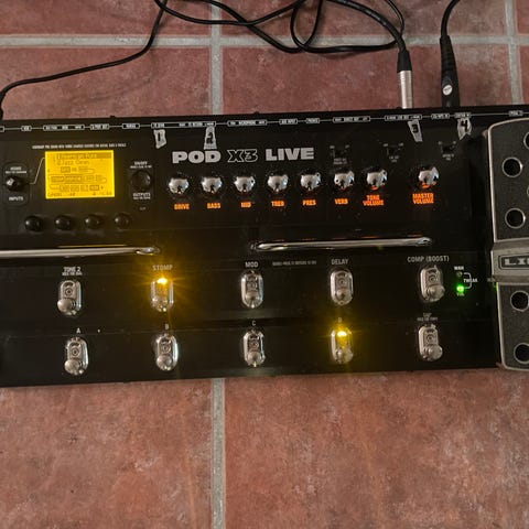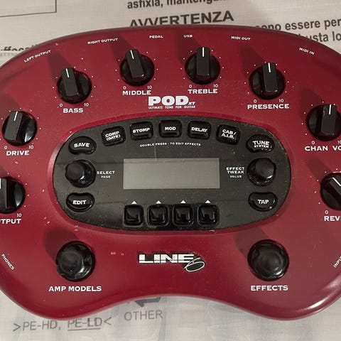 Line 6 POD 2.0 effektprosessor for gitar i rød farge. Enheten har kontroller for bass, treble, chorus, flanger, delay, spring reverb og tap tempo. Innganger for AMP, CD/MP3 og gitar er tilgjengelige. Ikke brukt.
