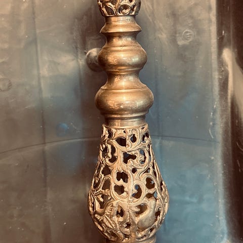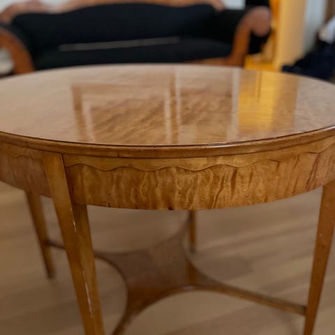 Den har en klassisk design med to buede armer og dekorative, svirrende detaljer som minner om rokokko-stilen.