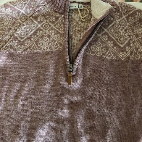 Ullgenser 80 prosent ull og 20 % polyester. Har høy hals med glidelås