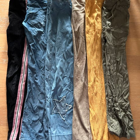 Den sorte er slengbukse, str 140, men er litt trang i størrelsen.