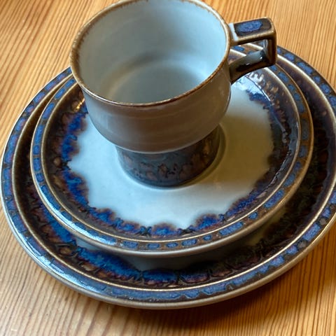 Mexico fra Bing & Grøndahl Denmark. Vintage servise. 8 stk. kuvert med kopp, skål og asjett diam. 16,5 cm. Serveringsfat, sukkerskål, fløtemugge og syltetøyskål medfølger. Alle deler som nye. Selges samlet.