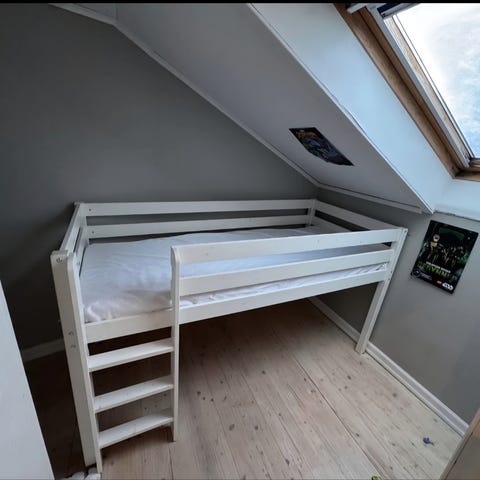Sengen er 90x200 og ca 4-5 år gammel, hel og pen bortsett fra at det en noen merker her og der. Det er værst på den ene siden inn mot veggen (se bilder)