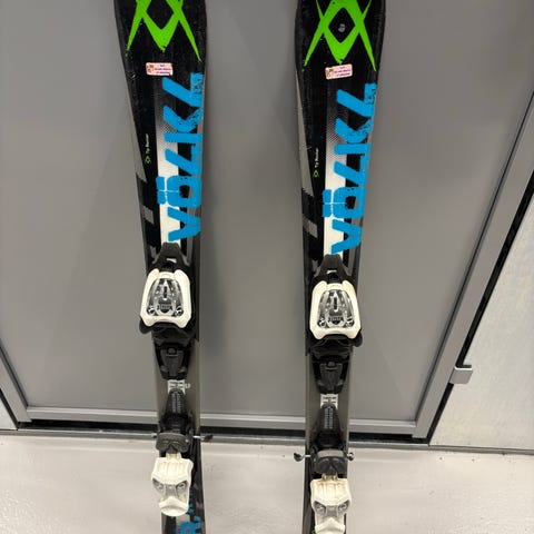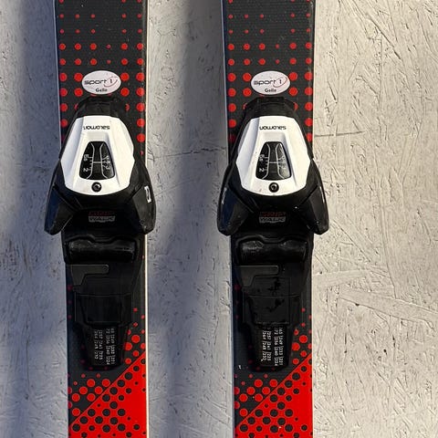 Stöckli GS 140 alpinski i rød farge. Skiene har en lengde på 140 cm og er designet for alpint bruk.