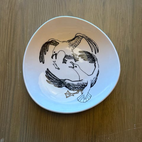 Stavanger Flint Turen". Tallerkenen er laget i porselen og produsert i Norge. Den har et dekorativt dyremotiv i sort-hvitt.