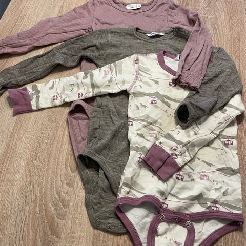 2 pent brukte ullbodyer.Lilla er janus, str 100. Et bittelite hull øverst med halsen. Rosa med blomster, name it er str 98.
