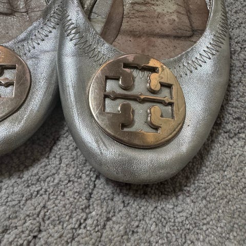 Tory Burch ballerina sko i størrelse 7,5. tilsvarer 37,5 eller 38. Brunt skinn. Skoene har en rund metallpynt på fronten med Tory Burch-logo.