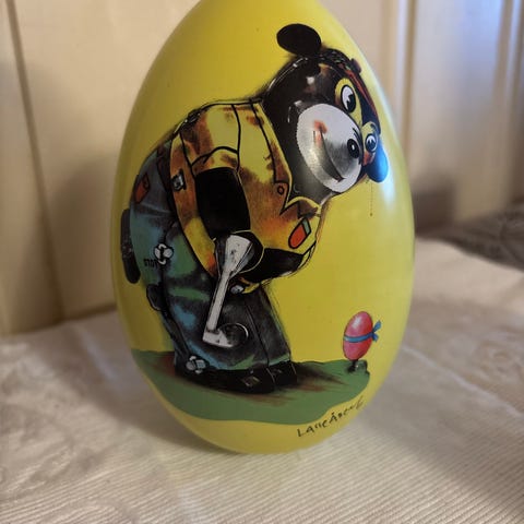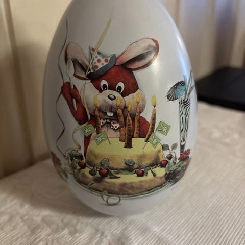 Søtt Lasse Åberg påskeegg med påskeharemotiv. Påskeegget er i metall. Små bruksmerker kan forekomme.
