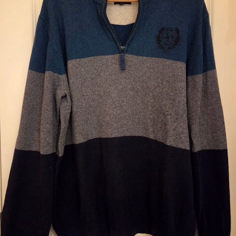 Jean Paul Lucien Block Stripe Knit genser i blå farge, størrelse XL. Genseren er laget av 60% bomull, 30% nylon og 10% ull. Den har glidelås i halsen og stripemønster. Passer for menn.