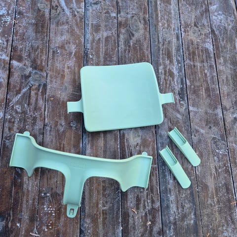 Komplett Stokke TrippTrapp sett. Ryggstøtte, spisebrett, bøyle, 2 putesett, sele. Alt sammen er nyvasket, inkl putene som kan vaskes i maskin. De andre delene kan vaskes i oppvaskmaskin.