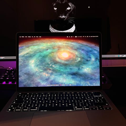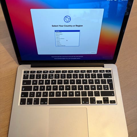 Apple MacBook Pro 13-tommer A1502 bærbar datamaskin i sølvfarge. Modellen kjører macOS Big Sur og har en skjermstørrelse på 13 tommer. Enheten har et beskyttende brunt deksel.