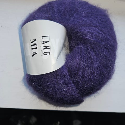 Lang Mia børstet alpakka, godt å strikke av og gir myke og lette plagg. Jeg har flere nøster om det skulle være ønskelig.