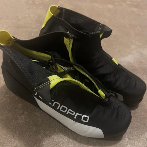 Tecnopro Skøytesko Langrenn i størrelse 31,5med svart og gul farge. Skøyteskoene har glidelås foran for enkel på- og avkledning og er laget for bruk ved langrenn. Til barn. Sendes mot porto.