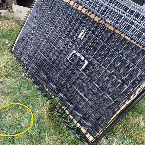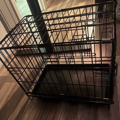 Selger et hundebur i god stand med mål ca. 60 × 43 × 51 cm (l × b × h). Buret er fra Europris, laget i sort metall med plastbunn, og har åpning både på kort- og langside for enkel tilgang. Det kan også pakkes flat ved behov, så det er lett å oppbevare når det ikke er i bruk.