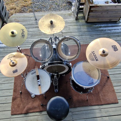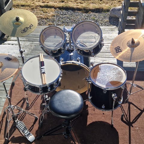 Selger et trommesett fra Yamaha Custom med basstromme 22'', og tre tommer 12'', 14'' og 16'' med hardware pakke og bagger for transport. Settet ble kjøpt fra forhandler i 2017.