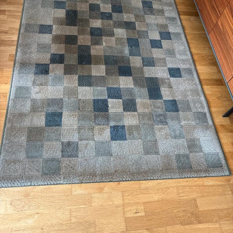 Teppe 80x160 i beige, mellomlange hår. Ligget på et soverom. Trenger rens og dermed selges billig