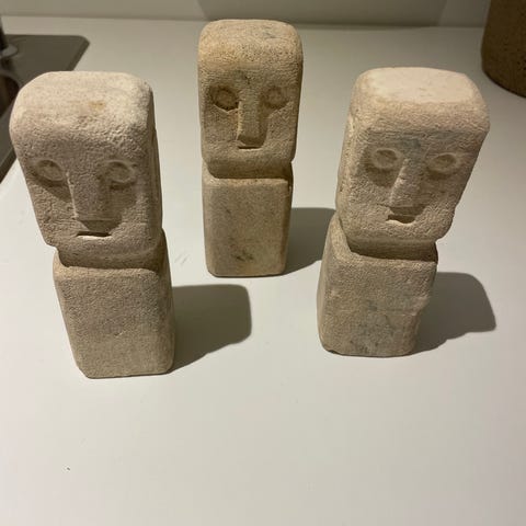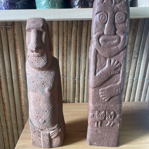 To håndlagde dekorative steinfigurer i ulike størrelser 17 og 25 cm. Begge figurene har en rustikk tekstur og en naturlig steinfarge. Passer som dekorasjon i hjemmet eller hagen.