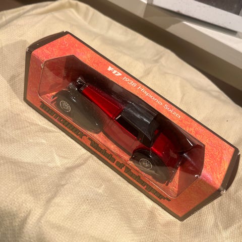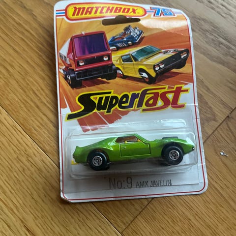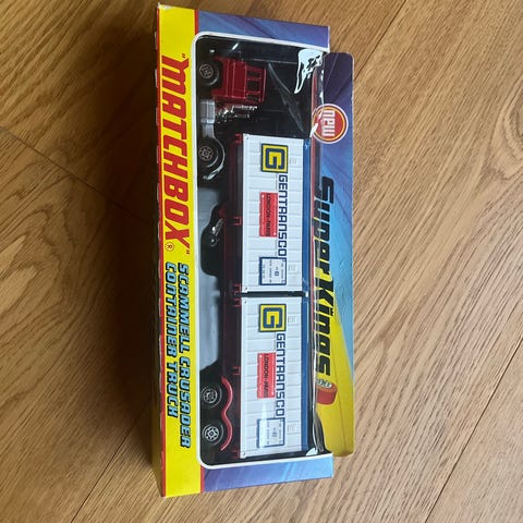 Matchbox Super Kings K-7 Racing Car Transporter. Modellen er en gul lastebil med tilhenger for transport av racingbiler, i original emballasje. En racerbil er inne lasteplanet