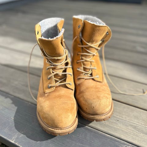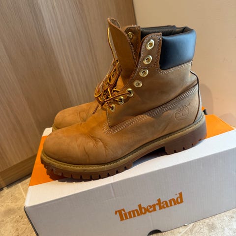Timberland støvler i størrelse 41. Støvlene har en lys brun farge og er laget i ekte skinn. Designet med snøring og solid gummisåle for godt grep. Innvendig foret med rutete tekstilmateriale. Pent brukt, selges da de har blitt for små.