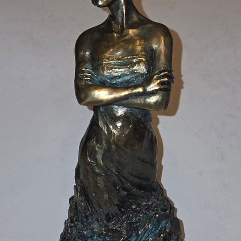 Selger en vakker og tung massiv bronzestatue i klassisk stil. Figuren forestiller en elegant kvinneskikkelse med barn/engel, utført med fine detaljer og flott patina. massiv bronse, noe som gir både tyngde og kvalitet.