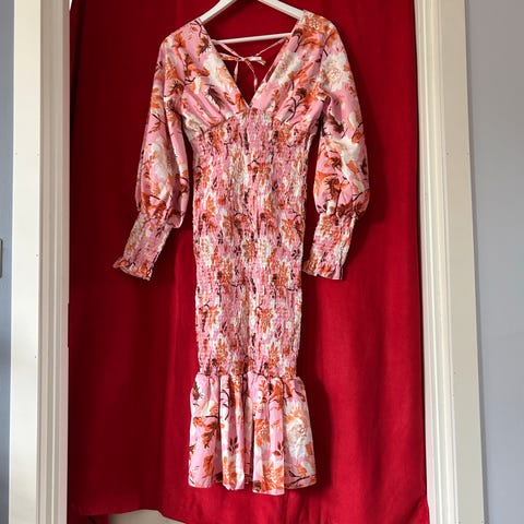 Selger en flott festkjole i elegant snitt. Merket er ukjent, men kjolen har god kvalitet og sitter pent på. Fremstår som meget pen, uten flekker eller skader.