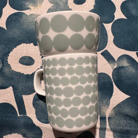 Marimekko Unikko krus Oiva med mørk blå blomst. Utgått farge. Jeg har to stykker, en ubrukt med lappene intakt, og en som er så lite brukt at den fremstår som ny. Utgått farge. Prisen er per stykk.