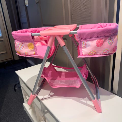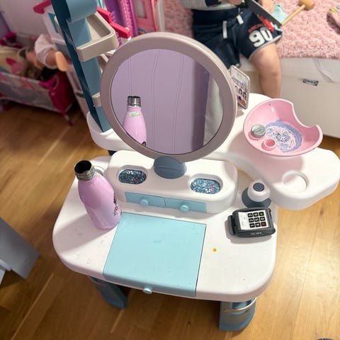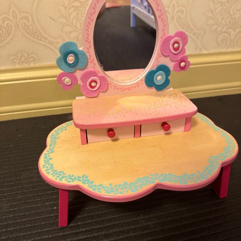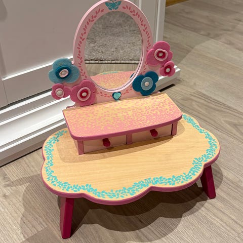 La barnet bruke fantasien og pynte seg ved dette søte sminkebordet. Med to små skuffer til å putte smykker, hårpynt eller sminke. Pent brukt med noe bruksmerker. Obs, Tilbehør følger ikke med!