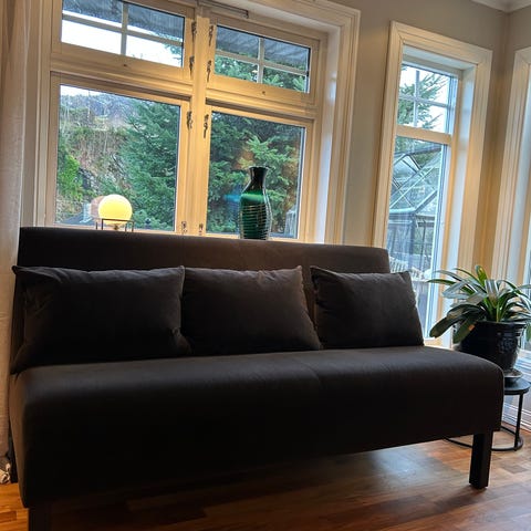 Daybeden er noe falmet av sol, og det finnes noen små flekker. Den har også sunket litt ned på den ene siden, da den har vært mest brukt der. Dette er tatt hensyn til i prisen.
