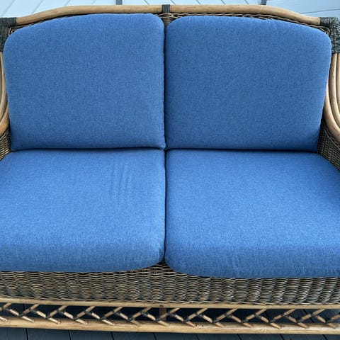 Daybeden er litt falmet av sol, og det finnes noen ubetydelige flekker. Den har sunket litt ned på den ene siden, da den har vært mest brukt der.