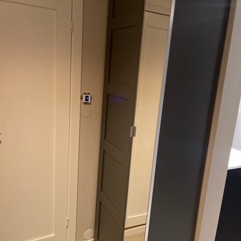 Selger garderobeskap med skyvedører. Ukjent leverandør da det stod her ved overtakelse.