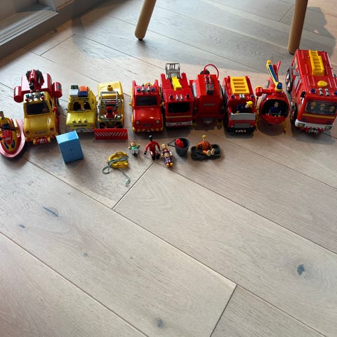 4 Brannmann Sam-figurer i større størrelse (ca. 7–9 cm). Brannmann Sam, Tom Thomas pilot, Georg, Helen Flood. Figurene er hele og fungerer fint i lek. Se mine andre annonser for flere pakker med brannmann Sam leker.