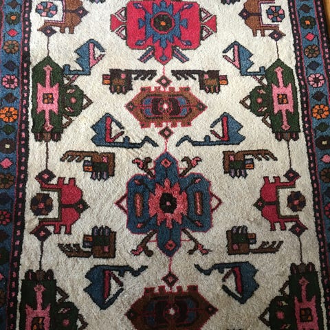 Gulvteppe i persisk /orientalsk stil. Teppet har vært i bruk. Det er noe slitt i ytterkant/ på frynsene, men er ellers i god vintage stand.