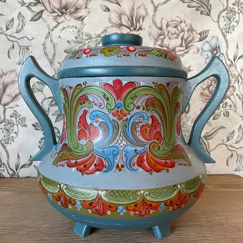 Lokket måler ca 18,2 cm hver vei uten hankene. Høyde ca 24 cm.