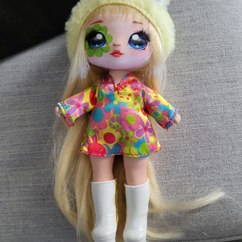 dukke med flerfarget hår, iført flerfarget kjole og rosa sko. Dukken kommer med flere små tilbehørsfigurer i ulike farger og former.