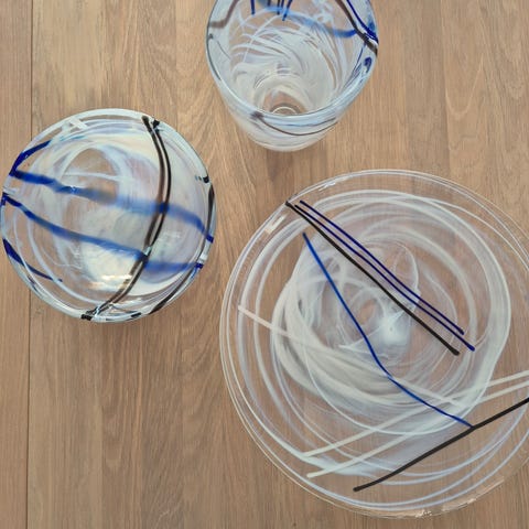 Kosta Boda kontrast glassfat med blå dekorasjon. Fatene har et unikt design med blått glass og hvite detaljer. Egnet som dekorasjon eller til servering.