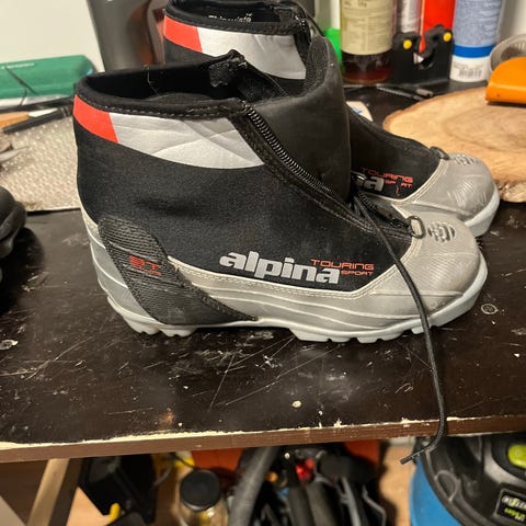 Svært pent brukte klassiske Alpina skisko langrenn (Touring T5 plus). Kjøpt nye og brukt til ett barn. Varme og gode, litt små i størrelsen.