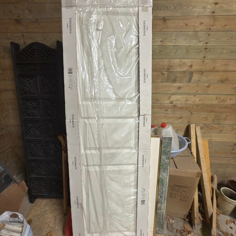 Hvite innerdører med klassisk profil, utstyrt med dørhåndtak i metall. Dørene har en tidløs design som passer til ulike interiørstiler.