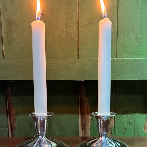 Et par lysestaker i 830s Lysestakene har en klassisk design med rund base og plass til tynne lys. Underlaget er dekket med grønt filt for å beskytte underlaget. Fint brukt, men trenger en puss.