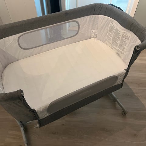 Selger en nydelig hvitmalt vugge/babyseng med madrass og dekorativ sengehimmel. Perfekt ved siden av foreldresengen.