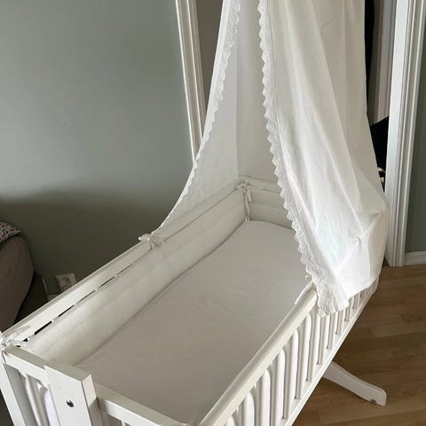 Pga flytting så gir jeg bort mot henting en babyseng/vugge med madrass og dekorativ sengehimmel.