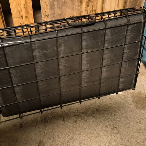 Selger et hundebur i god stand med mål ca. 91 × 57 × 65 cm (lengde × bredde × høyde). Buret er i sort metall med plastbunn, har åpning både på kort- og langside, og kan pakkes flat for enkel oppbevaring.