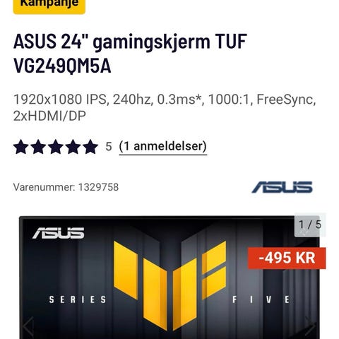 Selger en ASUS TUF Gaming VG249QL3A 24‑tommers spillmonitor med Full HD (1920 × 1080) oppløsning og 180 Hz oppdateringsfrekvens for jevn og responsiv grafikk. Skjermen gir hurtig 1 ms responstid og støtter Adaptive‑Sync (inkludert FreeSync Premium og G‑Sync kompatibilitet) for redusert tearing og hakking i spill.