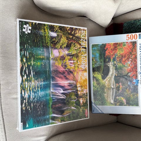 Totalt 11 puslespill med 1000 brikker hver, i ulike motiver og farger. Egnet for voksne og eldre barn. Materiale er papp. Solgt som en sett.