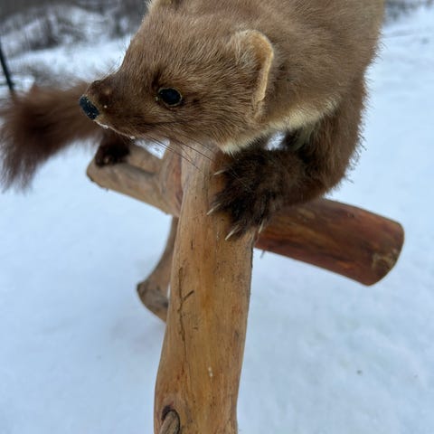 Utstoppet bever; naturlig pelsfarge, ingen skader. Montert på treplate med bjørkestamme.