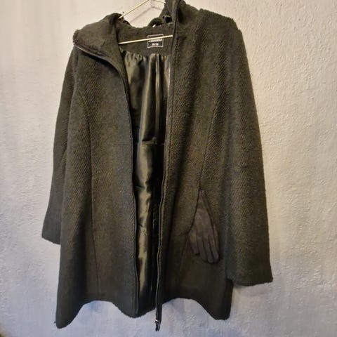 Flatterende og behagelig kåpe i størrelse 38 for dame. Jakken er i 56% ull, 56% og har en grønn farge. Den har et belte rundt midjen for justering.