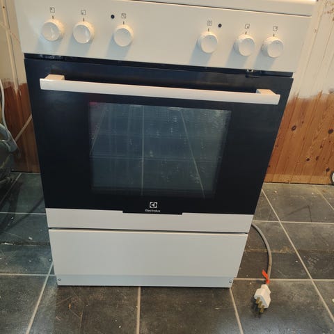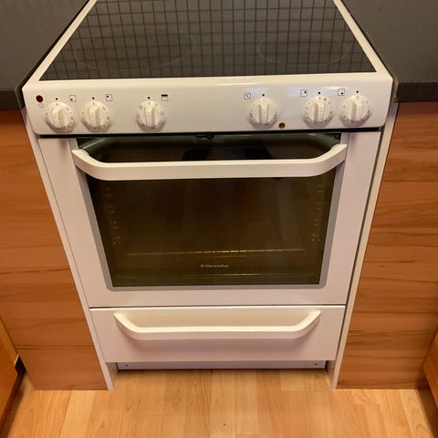 Pent brukt elektrolux komfyr med keramisk topp med origiutstyr 2 flate langpanner og en dyp langpanne, rist og steketermometer, bruksanvisning. Stor oppbevaring skuff under ovnen. Meget bra ovn og keramiske kokeplater fungerer som den skal. Innvendig lys i ovnen fungerer ikke. Selges rimelig med hurtig avgjørelse.